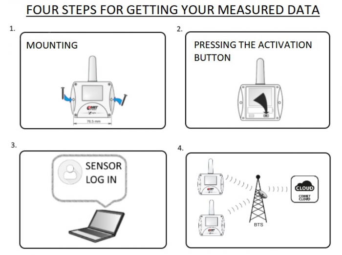 De uppmätta värdena skickas med ett justerbart tidsintervall (10 min till 24 h) via radiotransmission i Sigfox-nätverket till COMET Cloud, varifrån användaren kan se dem med en persondator eller mobil enhet.