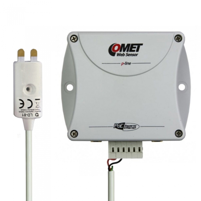 P-line Websensor med PoE för mätning av temperatur, relativ luftfuktighet, med översvämningsdetektor och binära ingångar för två-tillståndssignaler.